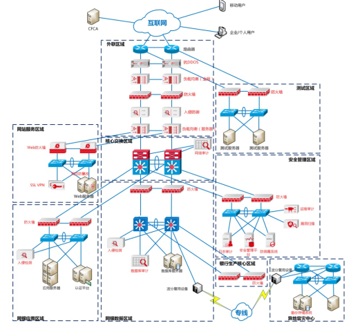 银行生产核心区域:该区域主要包括银行内部核心业务系统。通过防火墙防范来自网银区域的非法访问。